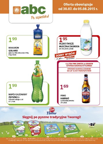 Nowa gazetka promocyjna sklepów ABC. Polecane promocje z gazetki ABC: Makaron jajeczny Goliard 250 g - 1,99 zł. Mleko świeże Mleczna Zagroda 1 L - 1,95 zł. Napój gazowany Zbyszko 3 cytryny 1,75 L - 1,99 zł. …