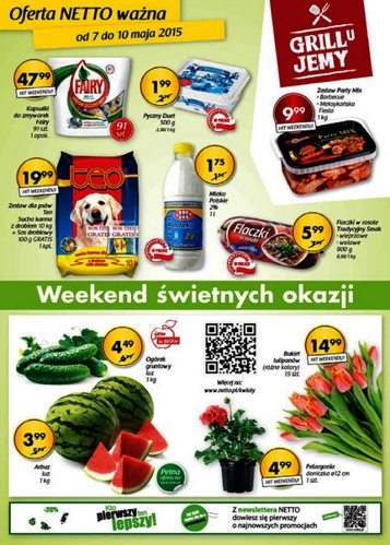 {loadposition linkNetto} Nowa gazetka promocyjna Netto - "Weekend świetnych okazji". Polecane promocje z gazetki Netto: Kapsułki do zmywarek Fairy 91 sztuk - 89 zł. Mleko Polskie 1 L - 1,75 zł. Arbuz 1 kg - 3,99 zł. …