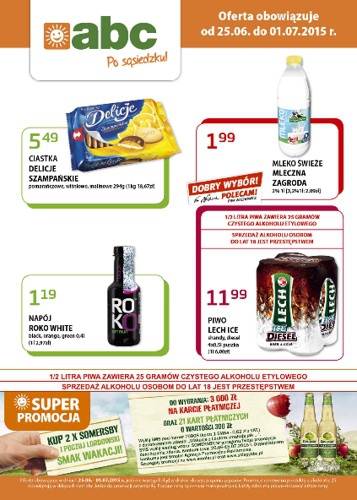 Nowa gazetka promocyjna sklepów ABC. Polecane promocje z gazetki ABC: Ciastka Delicje Szampańskie 294 g - 5,49 zł. Mleko świeże Mleczna Zagroda 1 L - 1,99 zł. Napój Roko White 400 ml - 1,19 zł. Oferta ważna…