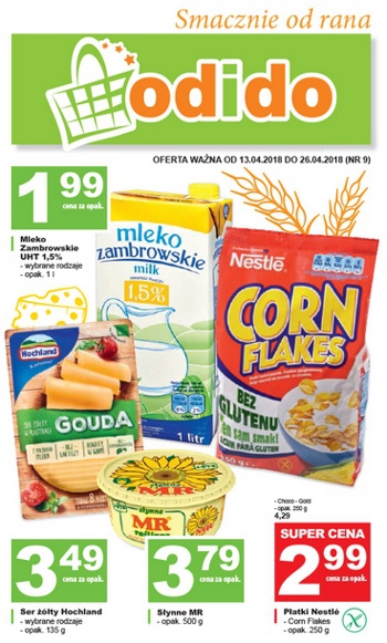 'Smacznie od rana' - nowa gazetka promocyjna sklepów Odido. Polecane promocje z gazetki Odido: Mleko Zambrowskie 1 L - 1,99 zł. Płatki Nestle Corn Flakes 250 g - 2,99 zł. Słynne MR 500 g - 3,79 zł. …