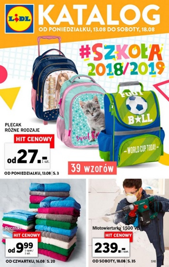 {loadposition linkLidl} '#Szkoła 2018/2019' - nowa gazetka promocyjna sieci sklepów Lidl. Polecane promocje z gazetki sklepów Lidl: Plecak różne rodzaje - od 27 zł. Ręcznik - od 9,99 zł. Młotowiertarka Parkside 1500 W - 239 zł. …