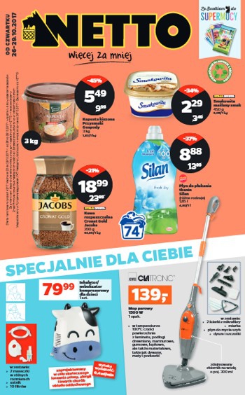 {loadposition linkNetto} Nowa gazetka promocyjna sieci sklepów Netto - "Specjalnie dla Ciebie". Polecane promocje z gazetki Netto: Inhalator / nebulizator kompresorowy dla dzieci - 79,99 zł. Mop parowy Clatronic 1500 W - 139 zł. Kapusta kiszona Przysmaki Gospody 3…