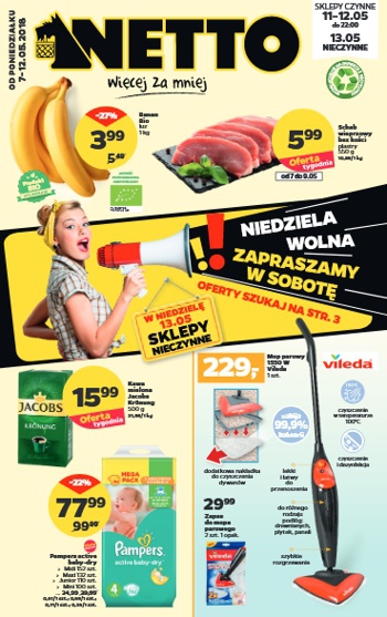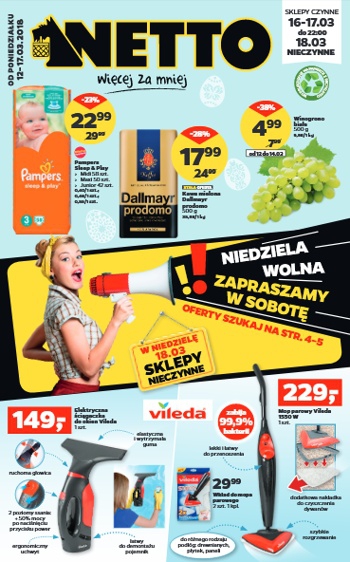 {loadposition linkNetto} 'Niedziela wolna! Zapraszamy w sobotę!' - nowa gazetka promocyjna sieci sklepów Netto. Polecane promocje z gazetki Netto: Elektryczna ściągaczka do okien Vileda - 149 zł. Mop parowy Vileda 1550 W - 229 zł. Wkład do mopa parowego…