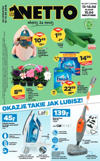 {loadposition linkNetto} Nowa gazetka promocyjna sieci sklepów Netto - "Gotowi do pomocy". Polecane promocje z gazetki Netto: Odkurzacz cykloniczny 700 W - 149 zł. Mop parowy Clatronic 1500 W - 139 zł. Pomarańcze 1 kg - 2,99 zł.…