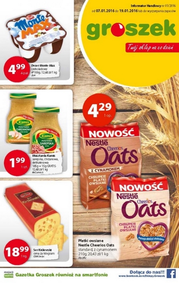 {loadposition linkGroszek} Nowa gazetka promocyjna sieci handlowej Groszek. Polecane promocje z gazetki Groszek: Płatki owsiane Nestle Cheerios Oats 210 g - 4,29 zł. Deser Monte Mix 4x100 g - 4,99 zł. Musztarda Kamis 200 g - 1,99 zł. …