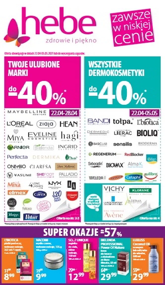 {loadposition linkHebe} Nowa gazetka promocyjna drogerii Hebe. Polecane promocje z gazetki Hebe: Mydło czarne Nacomi 125 g - 9,99 zł. Mgiełka do ciała So...? Unique 150 ml - 12,99 zł. Krem do twarzy z ekstraktem ze śluzu ślimaka Bielenda…