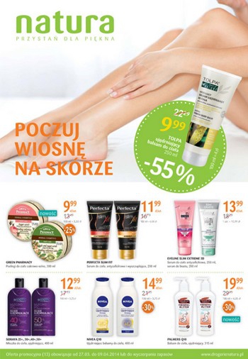 {loadposition linkNatura} Nowa gazetka promocyjna Drogerii Natura - "Poczuj wiosnę na skórze". Polecane promocje z gazetki Drogerii Natura: Balsam ujędrniający do ciała Tołpa 250 ml - 9,99 zł. Żel pod prysznic Palmolive 500 ml - 8,99 zł. Mydło w…