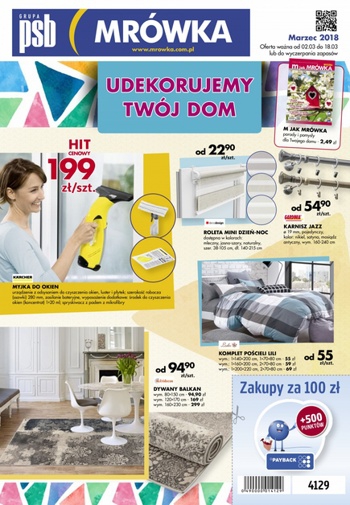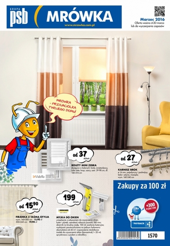 Nowa gazetka promocyjna PSB Mrówka. Polecane promocje z gazetki PSB Mrówka: Rolety mini Zebra - 37 zł. Karnisz Brok - 27 zł. Myjka do okien Karcher - 199 zł. Oferta ważna od 4.03 do 20.03 lub do…