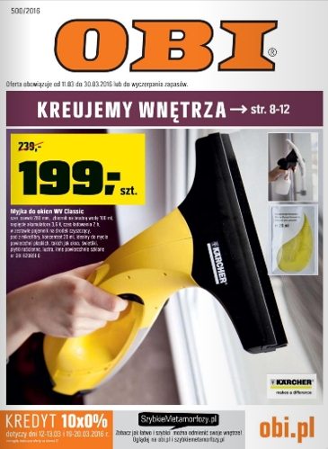 {loadposition linkObi} Nowa gazetka promocyjna Obi. Polecane promocje z gazetki Obi: Myjka do okien Karcher WV Classic - 199 zł. Myjka ciśnieniowa Karcher K 5 - 998 zł. Kosiarka spalinowa NAC - 899 zł. Oferta ważna od 20.03…