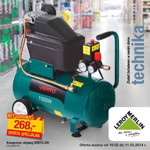 {loadposition linkLeroyMerlin} Nowa gazetka promocyjna Leroy Merlin - "Technika". Polecane promocje z gazetki Leroy Merlin: Kompresor olejowy VERTO 24 L - 268 zł. Przecinarka do glazury DEDRA - 245 zł. Myjka wysokociśnieniowa KÄRCHER - 399 zł. Oferta ważna…