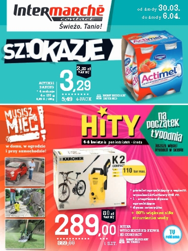 {loadposition linkIntermarche} Nowa gazetka promocyjna sieci handlowej Intermarche - "Sz!okazje". Polecane promocje z gazetki Intermarche: Actimel Danone 4x100 g - 3,29 zł. Myjka wysokociśnieniowa Karcher K2 Compact - 289 zł. Mleko dla dzieci Bebiko 2x800 g - 55 zł.…