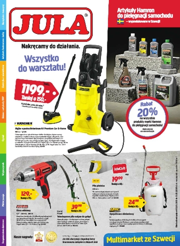 {loadposition linkJula} Nowa gazetka promocyjna sieci handlowej Jula - "Wszystko do warsztatu!". Polecane promocje z gazetki Jula: Myjka wysokociśnieniowa Karcher K4 Premium Car&Home 130 bar 1800 W - 1199 zł. Klucz udarowy Hamron 1/2" 400 Nm 450 W -…