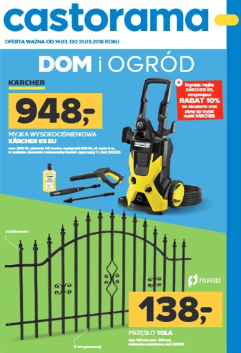 {loadposition linkCastorama} 'Dom i ogród' - nowa gazetka promocyjna sieci handlowej Castorama. Polecane promocje z gazetki Castorama: Myjka wysokociśnieniowa Karcher K5 EU - 948 zł. Przęsło Tola malowane proszkowo 120x200 cm - 138 zł. Kora iglasta 80 L -…