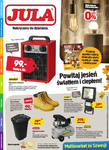 {loadposition linkJula} Nowa gazetka promocyjna sieci handlowej Jula - "Powitaj jesień światłem i ciepłem!". Polecane promocje z gazetki Jula: Nagrzewnica elektryczna Anslut 2000 W - 99 zł. Reflektor LED Anslut IP44 10 W 600 lm - 39,99 zł. Kompresor…
