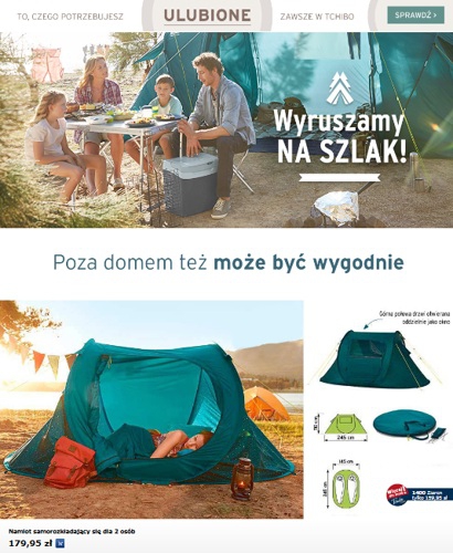 Nowa oferta Tchibo - "Odkrywaj piękno natury". Polecane promocje z gazetki Tchibo: Namiot rozkładający się dla 2 osób - 199,95 zł. Namiot rodzinny - 1099 zł. Pawilon - 399,95 zł. Oferta ważna do wyczerpania zapasów.