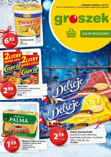 {loadposition linkGroszek} Nowa gazetka promocyjna sieci handlowej Groszek. Polecane promocje z gazetki Groszek: Twaróg na sernik Włoszczowa 1 kg - 6,85 zł. Napój Caprio 2 L - 2,99 zł. Margaryna Palma z Kruszwicy 250 g - 1,29 zł. …