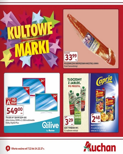 {loadposition linkAuchan} Nowa gazetka promocyjna Auchan - "Kultowe marki". Polecane promocje z gazetki Auchan: Telewizor LED 24 cale Qilive Q24-161 - 549 zł. Polędwiczka wieprzowa Henryk Kania Maestro 1 kg - 33,99 zł. Napój Caprio 2 L - 2,48…