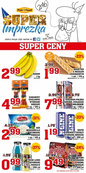 Nowa gazetka promocyjna sieci sklepów Piotr i Paweł - "Super imprezka". Polecane promocje z gazetki Piotr i Paweł: Banany 1 kg - 2,99 zł. Ser Mozzarella Galbani 125 g - 2,99 zł. Napój Frugo Lemo 250 ml -…