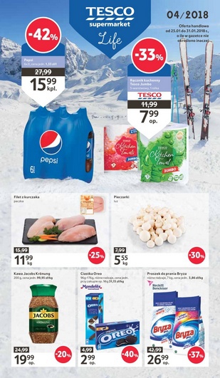 Nowa gazetka promocyjna sieci sklepów Tesco. Polecane promocje z gazetki Tesco: Napój gazowany Pepsi 6x2 L - 15,99 zł. Ręcznik kuchenny Tesco Jumbo 3-warstwowy 1 rolka - 7,99 zł. Filet z kurczaka 1 kg - 11,99…