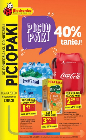 {loadposition linkBiedronka} 'Piciopaki dla każdego w Biedronkowych cenach' - nowa gazetka promocyjna sieci sklepów Biedronka. Polecane promocje z gazetki sieci Biedronka: Woda niegazowana Żywiec Zdrój 12x1,75 L - 17,88 zł. Napój gazowany Coca-Cola 8x1,75 L - 19,12 zł. Sok…