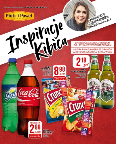'Inspiracje kibica' - nowa gazetka promocyjna sieci sklepów Piotr i Paweł. Polecane promocje z gazetki Piotr i Paweł: Piwo Namysłów Pils 500 ml - 2,19 zł. Chipsy Crunchips 2x200 g - 8,98 zł. Napój gazowany Coca-Cola lub Sprite…
