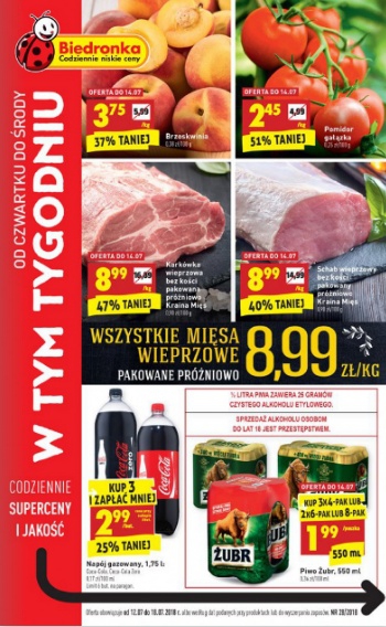 {loadposition linkBiedronka2} 'W tym tygodniu' - nowa gazetka promocyjna sieci sklepów Biedronka. Polecane promocje z gazetki sieci Biedronka: Brzoskwinie 1 kg - 3,75 zł. Pomidory gałązka 1 kg - 2,45 zł. Napój gazowany Coca-Cola 3x1,75 L - 8,97…