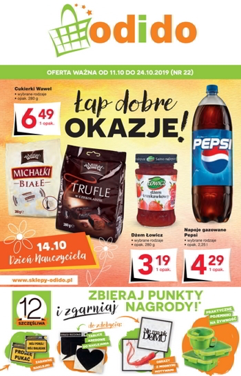 'Łap dobre okazje!' - nowa gazetka promocyjna sklepów Odido. Polecane promocje z gazetki Odido: Cukierki Wawel 280 g - 6,49 zł. Dżem Łowicz 280 g - 3,19 zł. Napój gazowany Pepsi 2,25 L - 4,29 zł.…