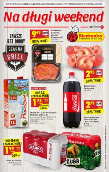 {loadposition linkBiedronka} Nowa gazetka promocyjna sieci handlowej Biedronka - "Na długi weekend". Polecane promocje z gazetki sieci Biedronka: Karkówka grillowa plastry Czas na grill 1 kg - 9,49 zł. Brzoskwinie Paraguayo 1 kg - 2,95 zł. Napój gazowany…