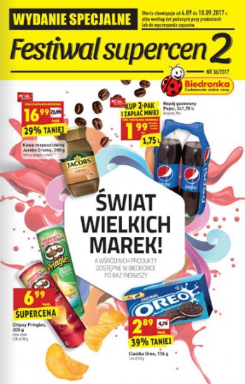 {loadposition linkBiedronka} Nowa gazetka promocyjna sieci sklepów Biedronka - "Festiwal super cen 2". Polecane promocje z gazetki sieci Biedronka: Kawa rozpuszczalna Jacobs Crema 200 g - 16,99 zł*. Napój gazowany Pepsi 4x1,75 L - 3,98 zł*. Chipsy Pringles…