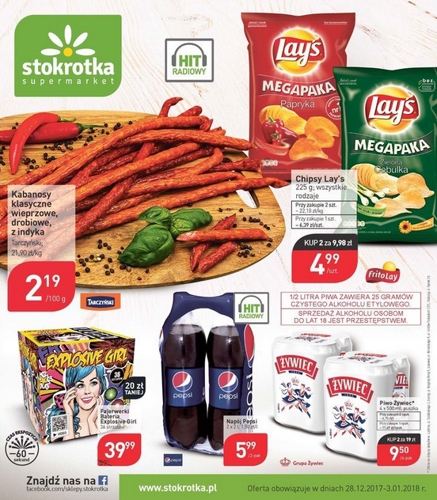 Nowa gazetka promocyjna sieci sklepów Stokrotka. Polecane promocje z gazetki Stokrotka: Kabanosy Tarczyński 100 g - 2,19 zł. Bateria Explosive Girl 36 strzałów - 39,99 zł. Napój gazowany Pepsi 2x2 L - 5,99 zł. Oferta…