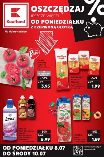 {loadposition linkKaufland} 'Oszczędzaj jeszcze więcej od poniedziałku z czerwoną ulotką' - nowa gazetka promocyjna sieci marketów Kaufland. Polecane promocje z gazetki Kaufland: Polskie pomidory malinowe układane 1 kg - 3,95 zł. Płyn do płukania tkanin Lenor wybrane rodzaje…