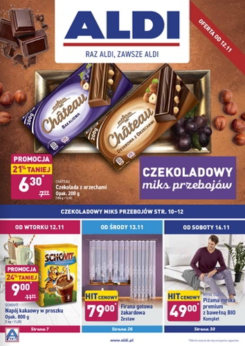 {loadposition linkAldi} 'Czekoladowy miks przebojów' - nowa gazetka promocyjna Aldi. Polecane promocje z gazetki Aldi: Czekolada z orzechami Chateau 200 g - 6,30 zł. Napój kakaowy w proszku Schovit 800 g - 9 zł. Firana gotowa żakardowa - 79…