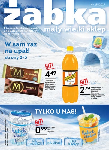 Nowa gazetka promocyjna sieci sklepów Żabka - "W sam raz na upał". Polecane promocje z gazetki Żabka: Lody Magnum Algida różne rodzaje - 4,49 zł. Kubek z lodem 130 g - 0,99 zł. Napój Schweppes 1 L -…