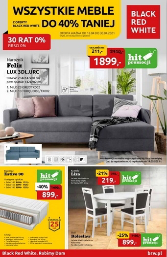 {loadposition linkBRW} 'Wszystkie meble do 40% taniej' - nowa gazetka promocyjna sieci sklepów meblowych Black Red White. Polecane promocje z gazetki Black Red White: Narożnik Feliz LUX 3DL.URC - 1899 zł. Materac Estivo 90 - 899 zł. Krzesło Liza…