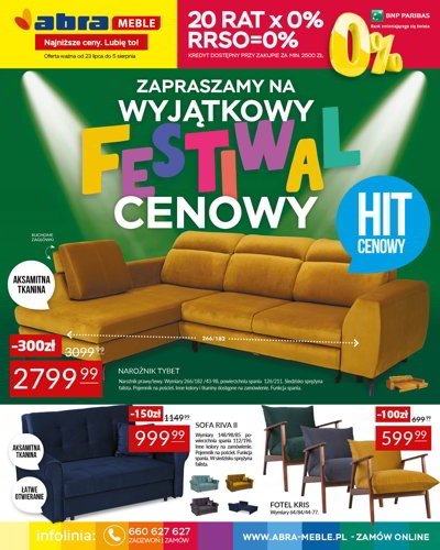 {loadposition linkAbra2} 'Zapraszamy na wyjątkowy festiwal cenowy' - nowa gazetka promocyjna sieci sklepów Abra Meble. Polecane promocje z gazetki Abra Meble: Narożnik Tybet - 2799,99 zł. Sofa Riva II - 999,99 zł. Fotel Kris - 599,99 zł. …