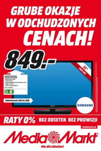 {loadposition linkMediaMarkt} Nowa gazetka promocyjna Media Markt - "Grube okazje w odchudzonych cenach!". Polecane promocje z gazetki Media Markt: Telewizor LED 32" SAMSUNG UE32H4000AW - 849 zł. Wieża SONY CMT-S20 - 299 zł. Nawigacja TOMTOM Start 20 Europa 45…
