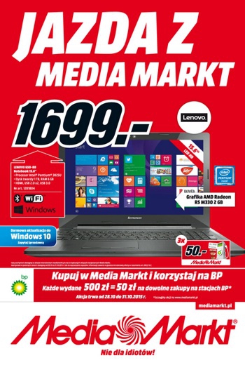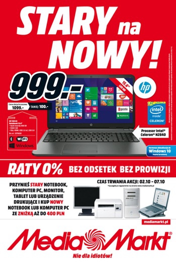 {loadposition linkMediaMarkt} Nowa gazetka promocyjna Media Markt - "Stary na nowy!". Polecane promocje z gazetki Media Markt: Notebook HP 250 G3 - 999 zł. Notebook ASUS F553MA-SX418B - 1099 zł. Tablet 2w1 LENOVO Miix 3-1030 - 1199 zł. …
