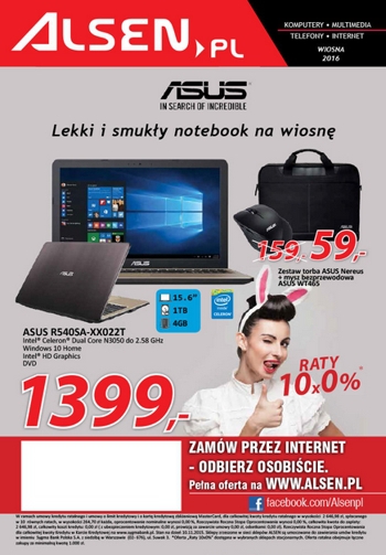 {loadposition linkAlsen} Nowa gazetka promocyjna sieci sklepów Alsen - Wiosna 2016. Polecane promocje z oferty Alsen: Notebook Asus R540SA-XX022T - 1399 zł. Monitor 21,5" LG 22MT44DP - 589 zł. Skaner Canon Lide 120 - 249 zł. Oferta ważna…