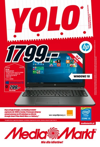 {loadposition linkMediaMarkt} Nowa gazetka promocyjna Media Markt - "YOLO". Polecane promocje z gazetki Media Markt: Notebook HP 250 G3 Windows 10 - 1799 zł. Notebook HP Stream 13-c001 - 1199 zł. Notebook LENOVO G50-30 80G001QGPB/YUPB/80G0024UPB - 1349 zł. …