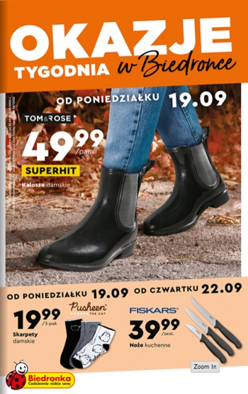 {loadposition linkBiedronka5} 'Okazje tygodnia' - nowa gazetka promocyjna sieci sklepów Biedronka. Polecane promocje z gazetki sieci Biedronka: Kalosze damskie Tom&Rose - 49,99 zł. Skarpety damskie 3-pak - 19,99 zł. Noże kuchenne Fiskars 1 zestaw - 39,99 zł. …