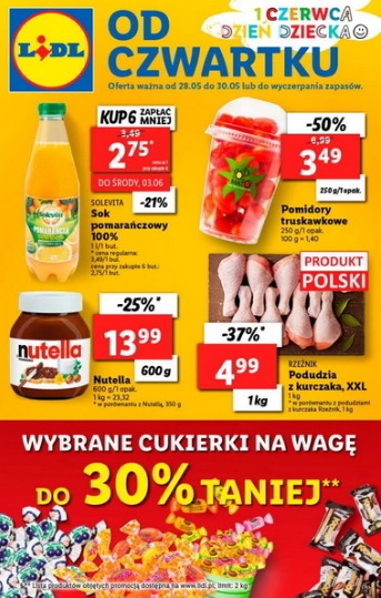 {loadposition linkLidl2} 'Od czwartku' - nowa gazetka promocyjna sieci sklepów Lidl. Polecane promocje z gazetki sklepów Lidl: Sok pomarańczowy Solevita 6x1 L - 16,50 zł. Pomidory truskawkowe 250 g - 3,49 zł. Nutella 600 g - 13,99…