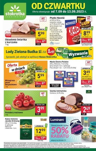 {loadposition linkStokrotka} 'Od czwartku' - nowa gazetka promocyjna sieci sklepów Stokrotka. Polecane promocje z gazetki Stokrotka: Obiadowa ćwiartka z kurczaka 1 kg - 5,99 zł*. Masło ekstra Łaciate 200 g - 3,49 zł**. Szynka od szwagra Krakus 100 g…