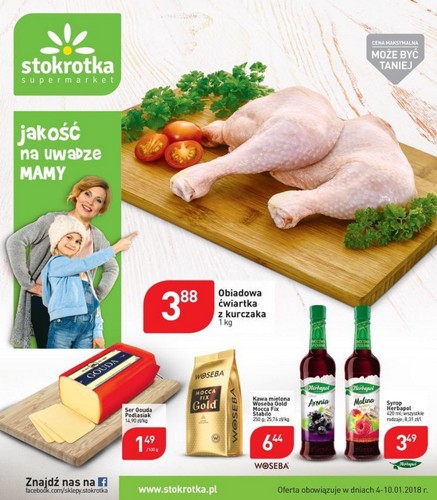 Nowa gazetka promocyjna sieci sklepów Stokrotka -"Jakość na uwadze mamy". Polecane promocje z gazetki Stokrotka: Obiadowa ćwiartka z kurczaka 1 kg - 3,88 zł. Ser Gouda Podlasiak 100 g - 1,49 zł. Syrop Herbapol 420 ml -…
