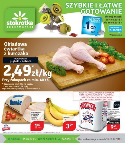 'Szybkie i łatwe gotowanie' - nowa gazetka promocyjna sieci sklepów Stokrotka. Polecane promocje z gazetki Stokrotka: Obiadowa ćwiartka z kurczaka 1 kg - 2,49 zł*. Pierś gotowana z indyka Bianka Indykpol 100 g - 1,89 zł. Banany…