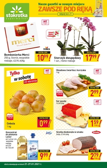 Nowa gazetka promocyjna sieci sklepów Stokrotka. Polecane promocje z gazetki Stokrotka: Bombonierka Merci 250 g - 10,99 zł. Storczyk dwupędowy - 17,99 zł. Obiadowa ćwiartka z kurczaka 1 kg - 2,99 zł. Oferta ważna od czwartku 21.01…