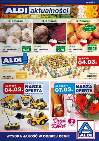 {loadposition linkAldi} Nowa gazetka promocyjna Aldi. Polecane promocje z gazetki Aldi: Orchidea - 15,99 zł. Obrus wielkanocny - 19,99 zł. Jajka wielkanocne dekoracyjne 16 sztuk - 8,99 zł. Oferta ważna od 4.03 do wyczerpania zapasów.