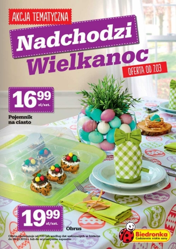 {loadposition linkBiedronka} Nowa gazetka promocyjna sieci handlowej Biedronka - "Nadchodzi Wielkanoc". Polecane promocje z gazetki sieci Biedronka: Pojemnik na ciasto - 16,99 zł. Obrus - 19,99 zł. Dekoracyjny pokrowiec na krzesło - 19,99 zł. Oferta ważna od 7.03…