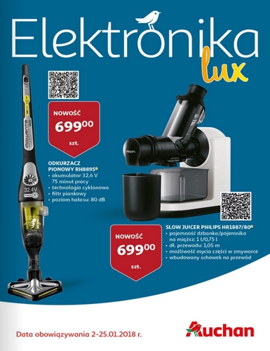 {loadposition linkAuchan} Nowa gazetka promocyjna sieci marketów Auchan - "Elektronika Lux". Polecane promocje z gazetki Auchan: Odkurzacz pionowy Rowenta RH8895 - 699 zł. Slow Juicer Philips HR1887/80 - 699 zł. Pralka Samsung WW60K2109W/EO - 1759 zł. Zakupy w…