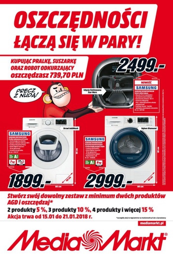{loadposition linkMediaMarkt} Nowa gazetka promocyjna Media Markt - "Oszczędności łączą się w pary!". Polecane promocje z gazetki Media Markt: Odkurzacz SAMSUNG VR10M703PW9/GE - 2499 zł. Pralka SAMSUNG WW70K5210XW/EO - 1899 zł. Suszarka SAMSUNG DV90M52003W/EO - 2999 zł. …