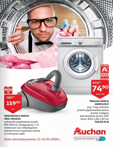 {loadposition linkAuchan} Nowa gazetka promocyjna sieci marketów Auchan. Polecane promocje z gazetki Auchan: Odkurzacz Amica Ora VM1035 - 159 zł. Pralka Amica AWB510LP - 749 zł. Blender kielichowy Łucznik BL 566 - 89 zł. Zakupy w Auchan przez…